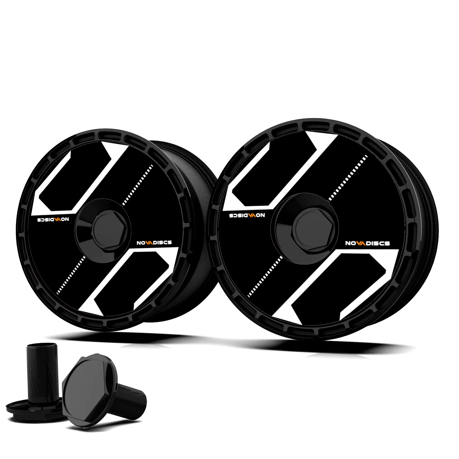 Bold white arrow-shaped shield panels on a black disc face with dotted accent lines. Graphic and aggressive.